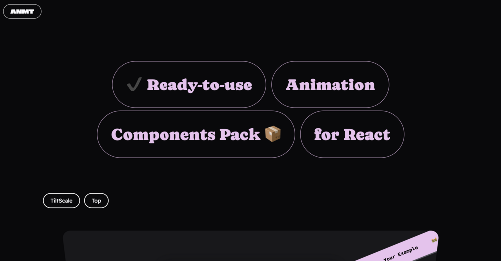 ANMT Animation Kit contains 5 categories of Components with 35+ types and 700+ possible combinations compatible with React & Typescript.