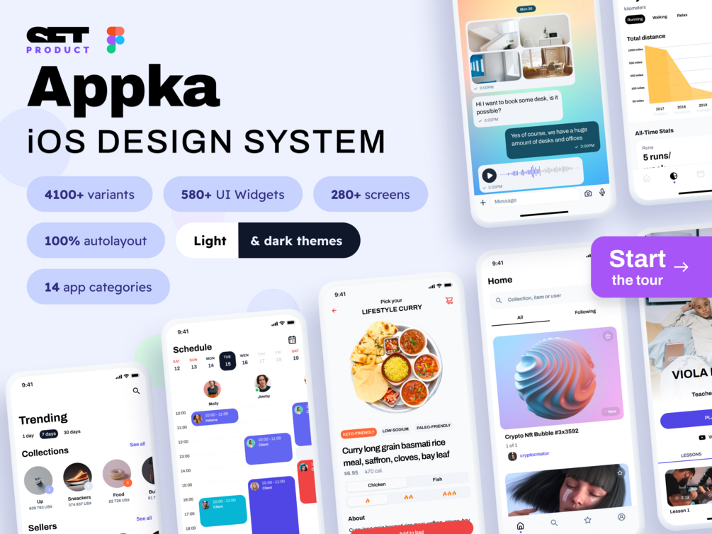 Appka is a customizable & adjustable iOS design system with 4100+ variants for 28 components and 280+ ready-to-use app layouts crafted for Figma. You can edit, modify, or use them as it is to save time and never design from scratch again. Contains dark & light themes, based on free font Archivo.