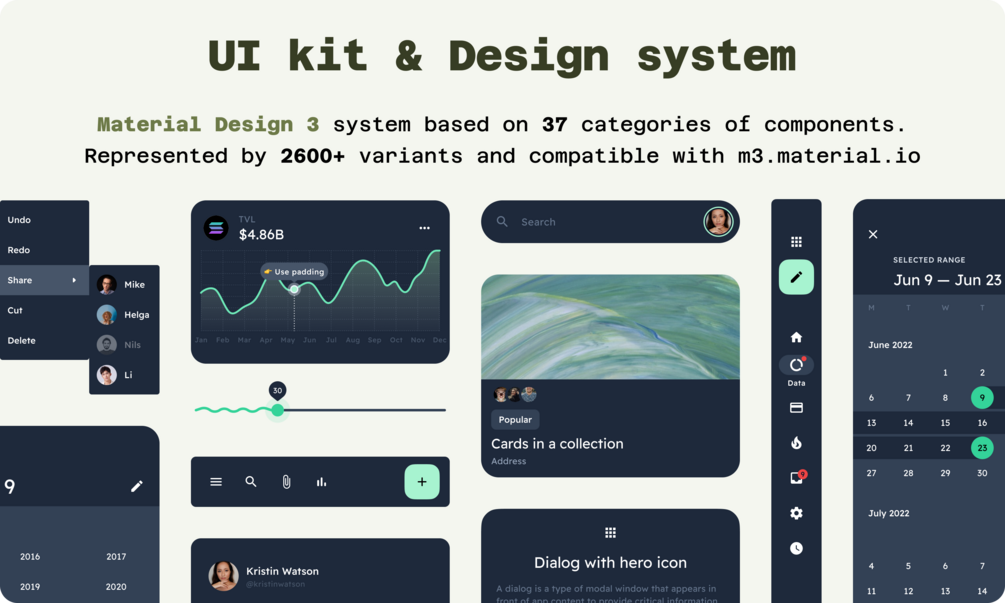 Material Me UI kit is a web-optimized design system with 3000+ variants for 39 components and 350+ ready-to-use app layouts crafted for Figma.