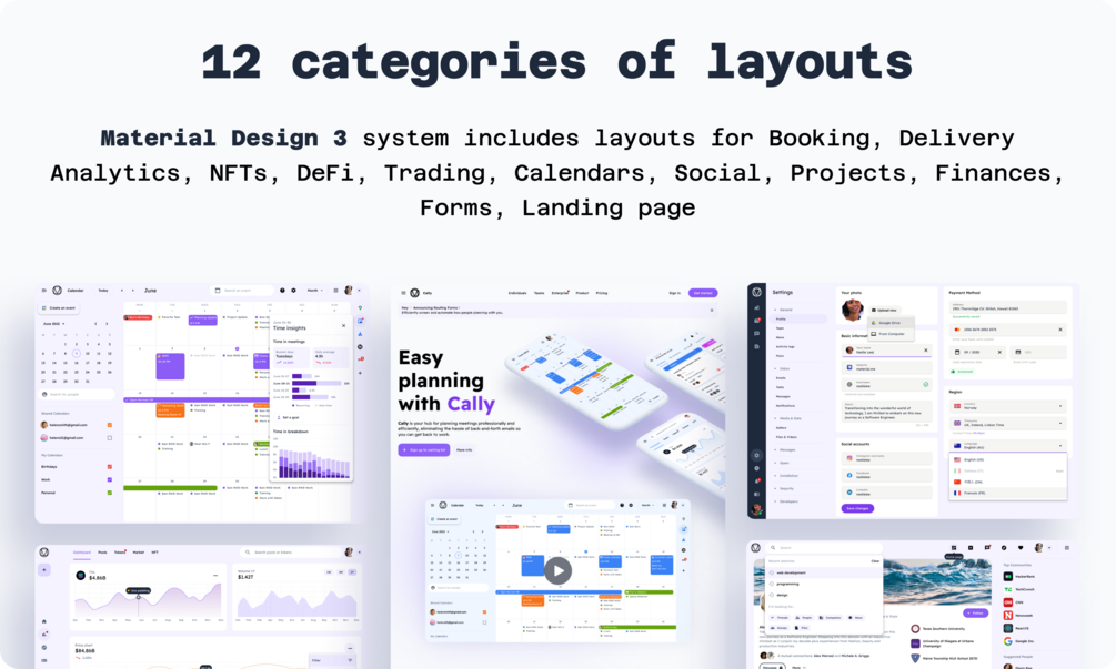 • Includes layouts for Booking, Delivery, Analytics, NFTs, DeFi, Trading, Calendars, Social, Projects, Finances, Forms, Landing page and others: